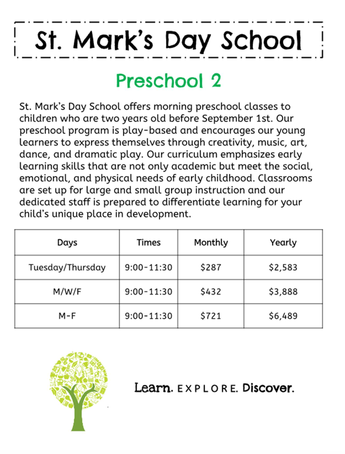 The twos program is a play-based program that allows these precious young children ample time to investigate and explore. Children are encouraged to express themselves creatively through art, music, dance, and dramatic play.